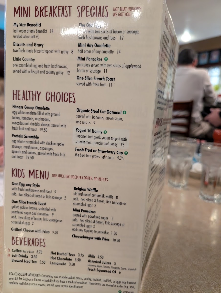Toasted English Muffin, sliced grilled tomatoes, 2 strips of bacon, 1 poached egg topped with hollandaise.